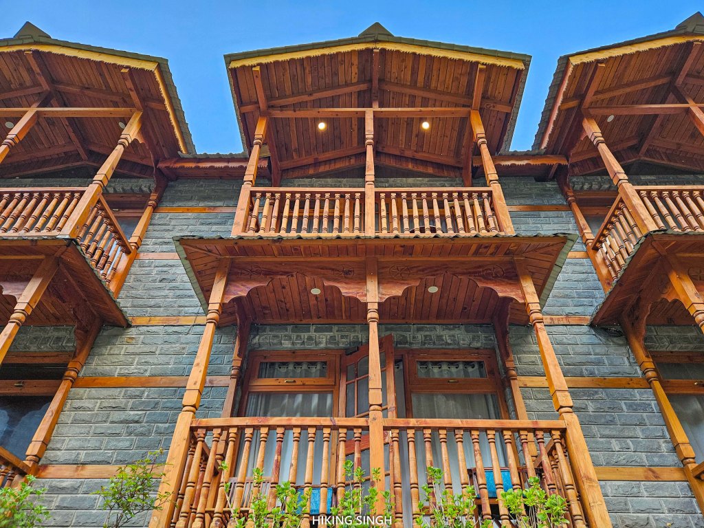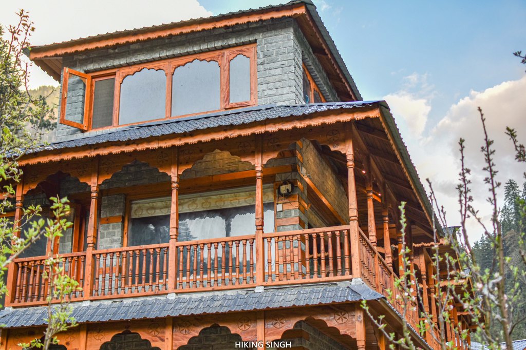 The design of Blue Stream Cottage is one of its unique features that adds to its charm and appeal. The cottage is designed with a traditional Kath kuni architecture that is commonly found in the Himachal Pradesh, giving it a rustic and cozy ambiance. It is a traditional technique that uses alternating layers of wood and stone masonry, held in place without using mortar. The wooden beams and stone masonry are interlocked without the use of any nails or metal fasteners. This ancient technique requires skilled craftsmanship and is known for its earthquake-resistant properties, making it well-suited for the hilly terrain of the region. This design is most evident in the temples in the region.