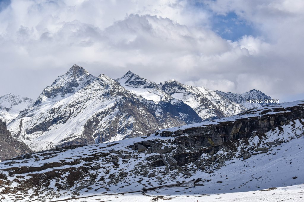 The Pir Panjal Range, which extends into the Lahaul region, is prominently visible from Rohtang Pass. This range is characterized by its lush landscapes and several high-altitude peaks and passes. The range’s snowy summits and steep slopes create a dramatic backdrop against the sky.